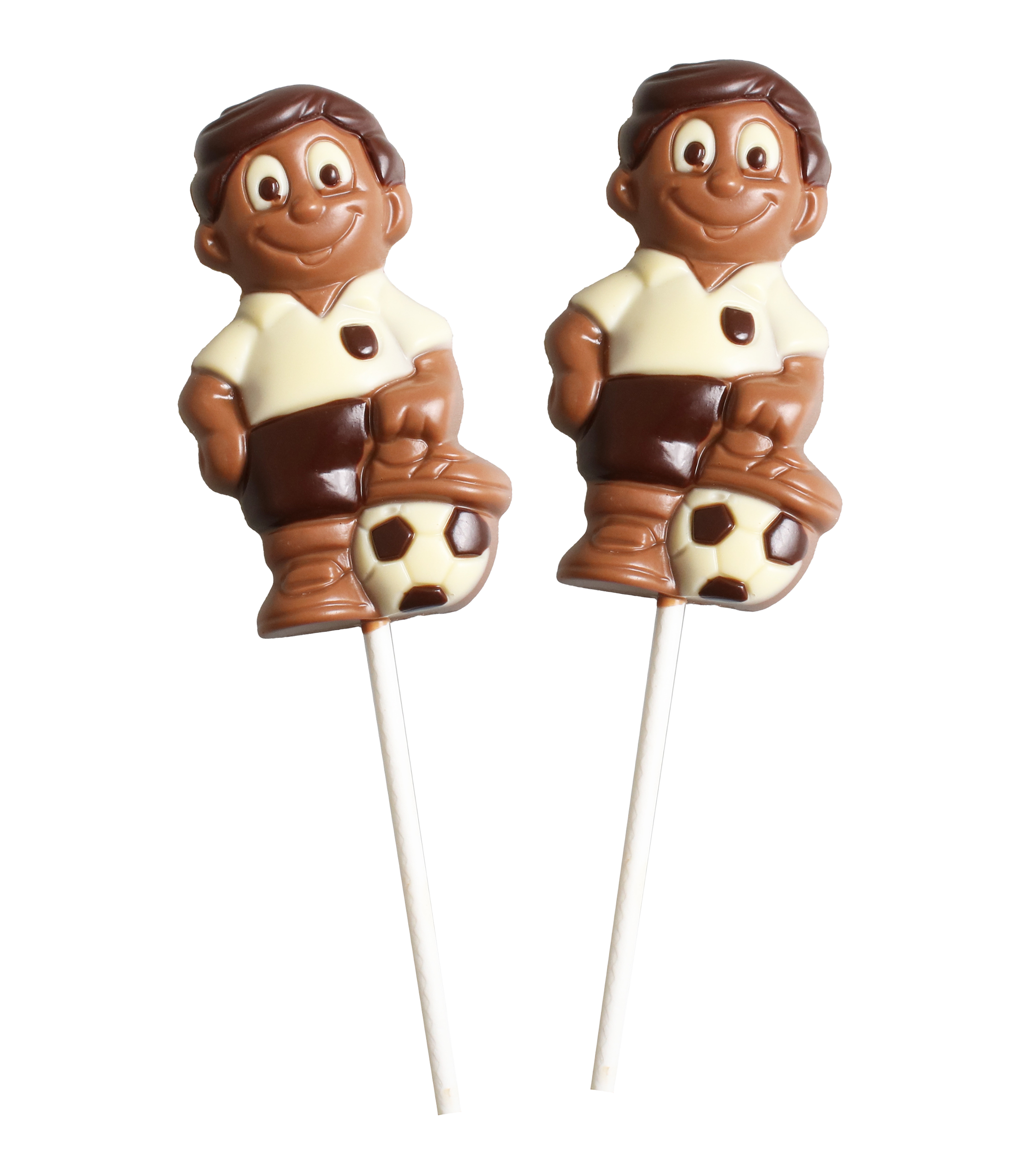 Mjölkchokladfigurer i form av en fotbollspelare med boll. Tillverkad av belgisk kvalitetschoklad. Styckförpackade i bordsdisplay.